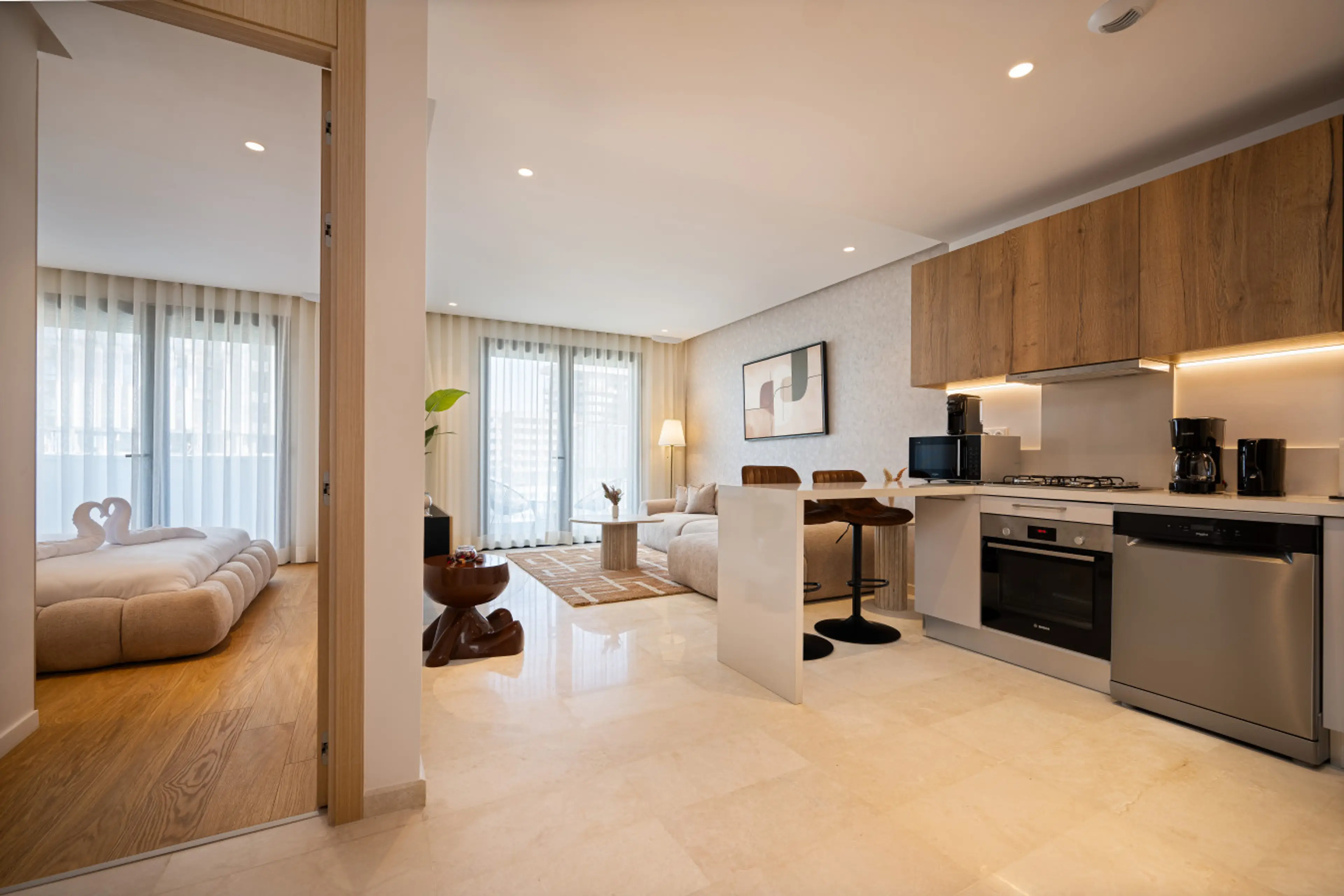 Welcome to the Sand Dune Studio, a warm and elegant space in Casa Finance City, Casablanca’s newest and most secure district. Inspired by soft beige and dune tones, this studio offers a calming atmosphere with a hotel-quality bed, fully equipped kitchen, high-speed Wi-Fi, Smart TV, and workspace. St...